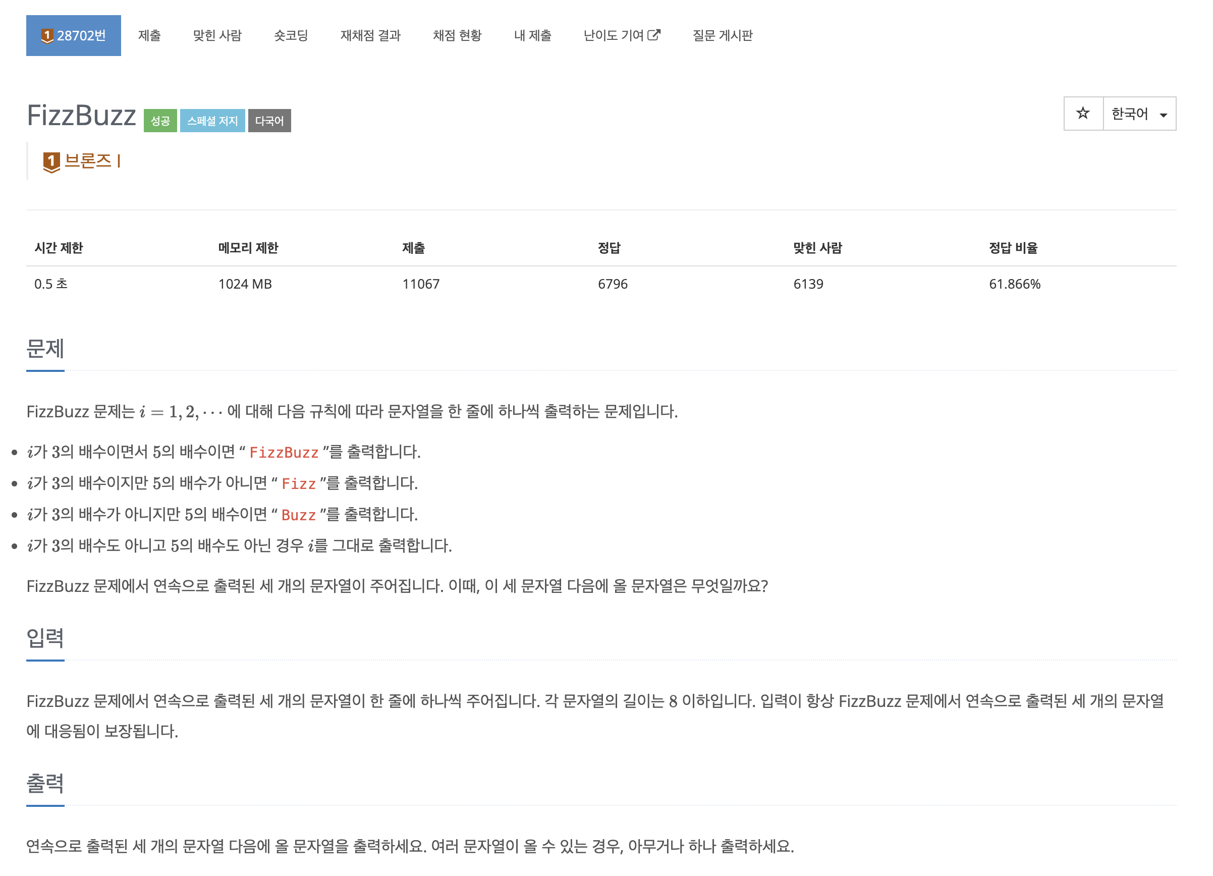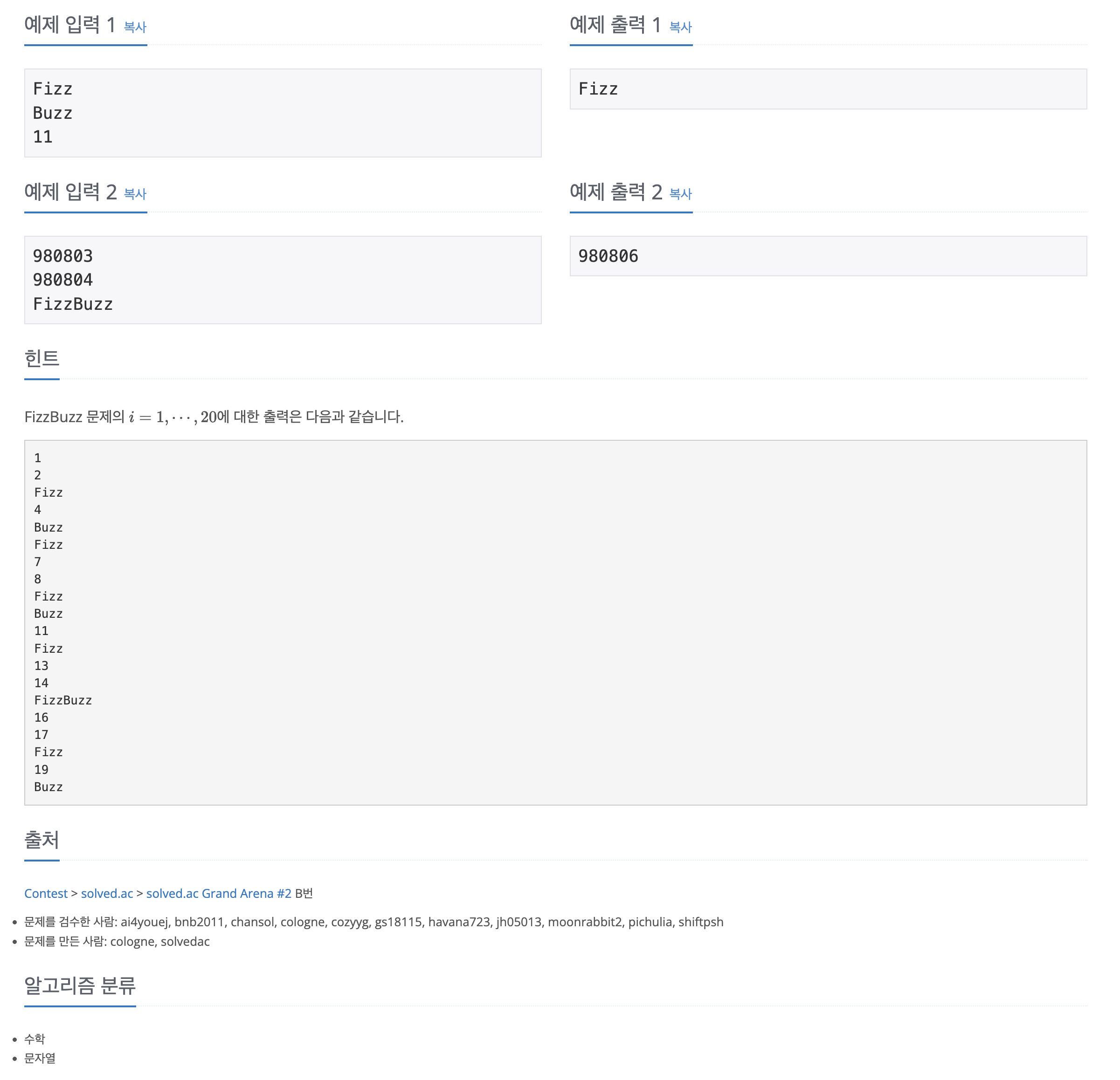 3의 배수면서 5의 배수가 아닌 Fizz, 5의 배수면서 3의 배수가 아닌 Buzz, 3의 배수면서 5의 배수인 FizzBuzz는 3가지가 연속으로 등장할 수 없다. 이를 활용해 세가지 입력값 중 숫자가 등장한 경우를 isNumber 메서드로 찾은 후 해당 숫자의 위치로 연속으로 출력된 세 개의 문자열 다음에 올 숫자를 구한다. 해당 숫자가 다시 3의 배수, 5의 배수인지 여부를 getFizzBuzzNumber 메서드로 판단해서 출력하도록 구현했다.